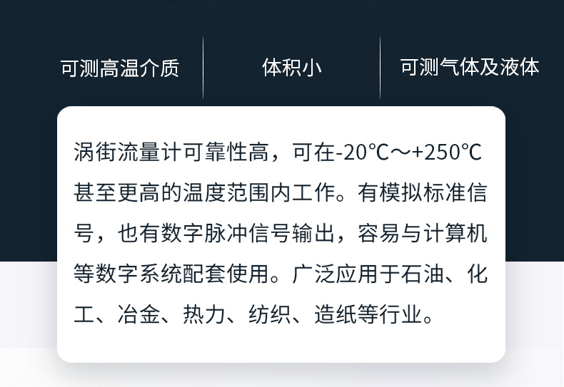 涡街流量计可靠性高,可在-20℃~+250℃甚至更高的温度范围内工作。有模拟标准信号,也有数字脉冲信号输出,容易与计算机等数字系统配套使用。广泛应用于石油、化工、冶金、热力、纺织、造纸等行业。